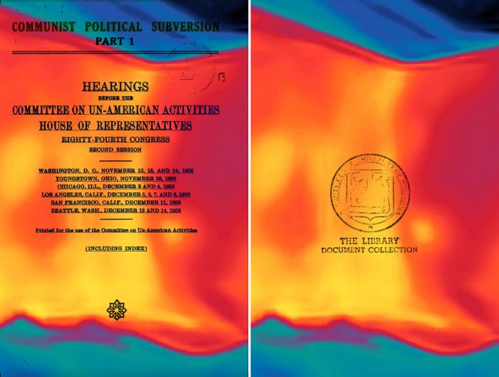 Medium: Series of Archival Prints of Committee on Un-American Activities, House of Representatives (1956) with overlaid images of Ryu’s body produced through FLIR thermal technology