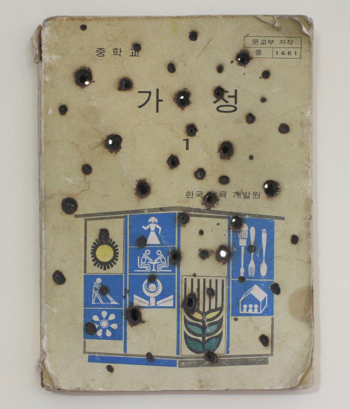 Medium: Korean textbook published in 1980 burnt by a magnifying glass and sun